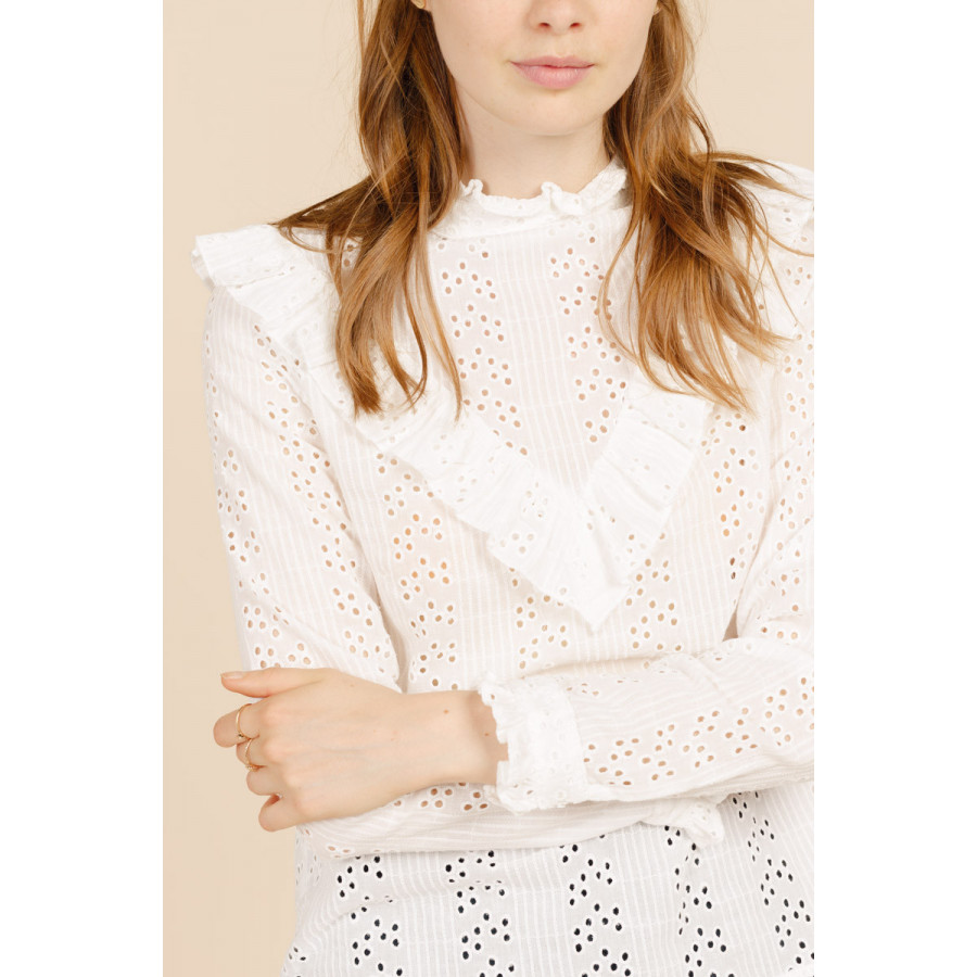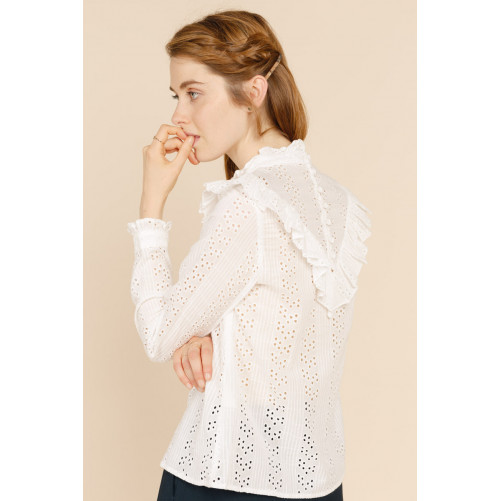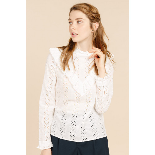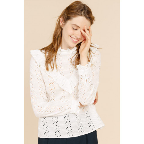 Délicatesse et volupté, cette blouse avec ses volants ajourés vous séduira sans aucun doute.