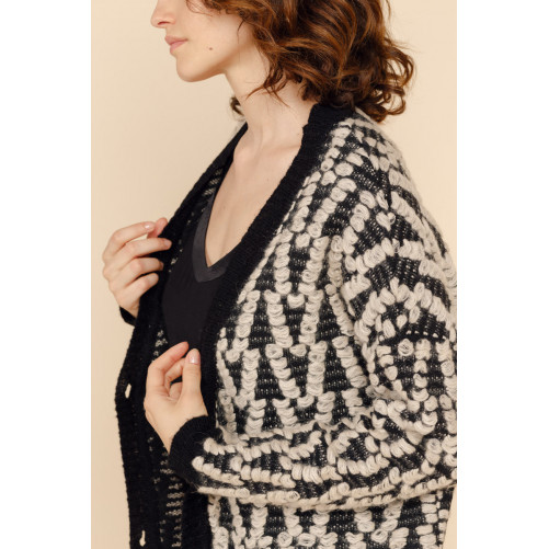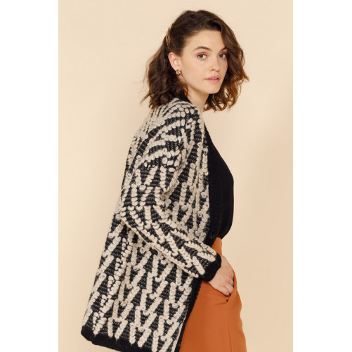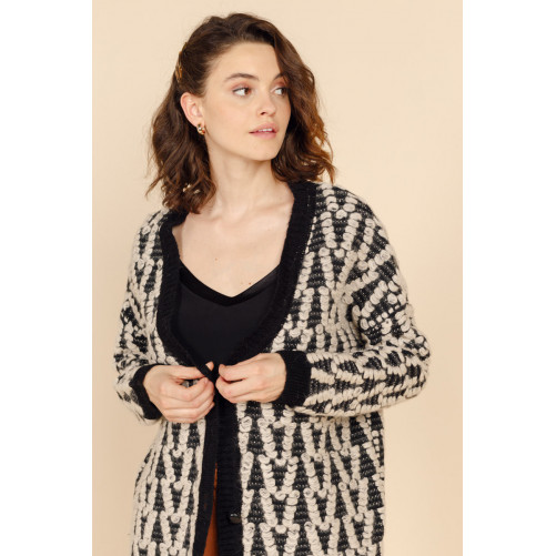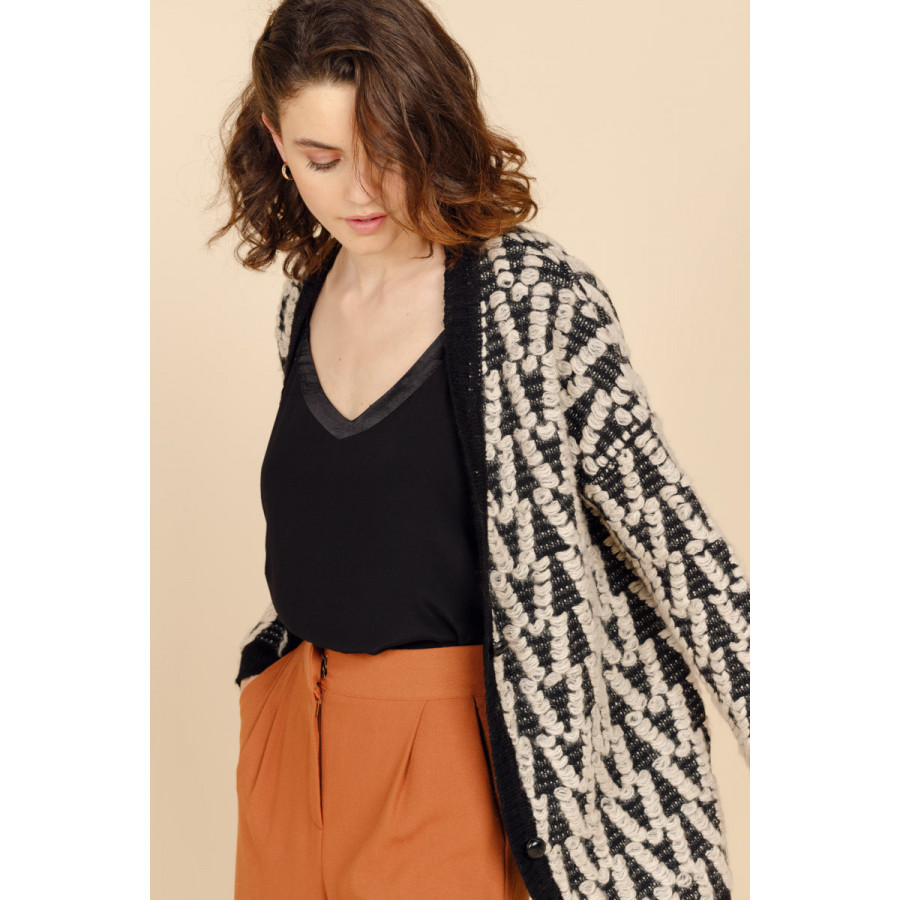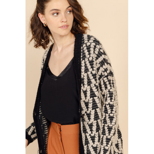 On passe l'hiver au chaud avec le gilet long FAUSTINE. On craque pour sa coupe ample et sa grosse maille aux détails effilés.