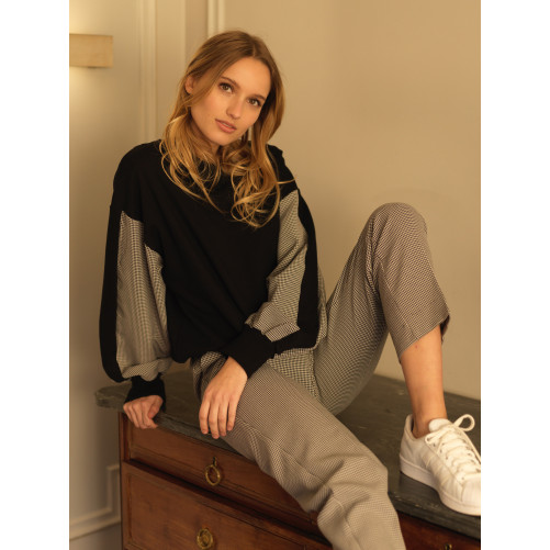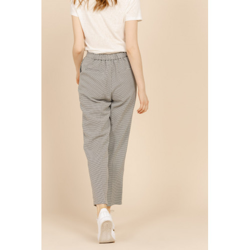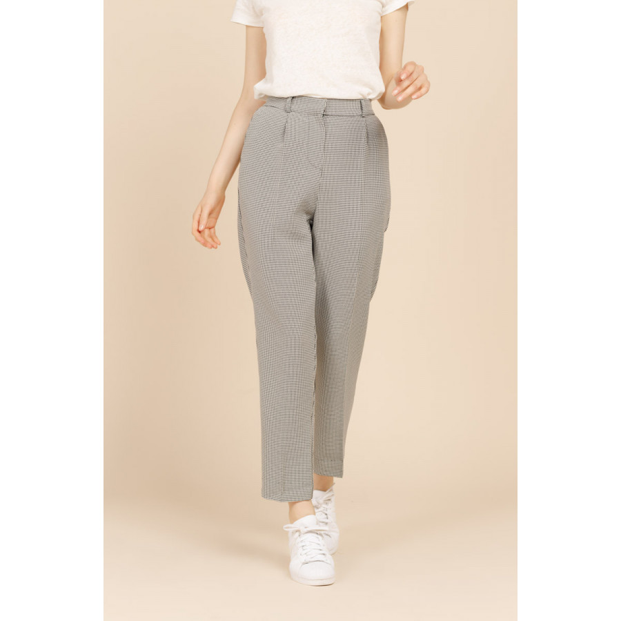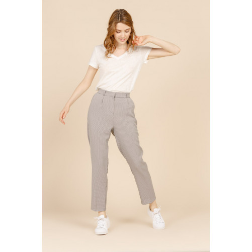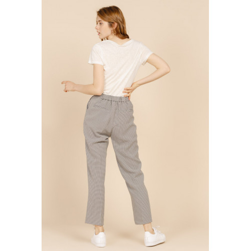 On joue la carte d'une allure couture avec son imprimé pied-de-poule tout en privilégiant le confort avec une ceinture élastique à la taille.