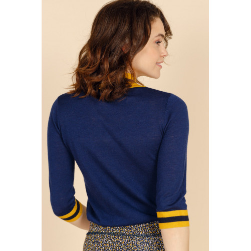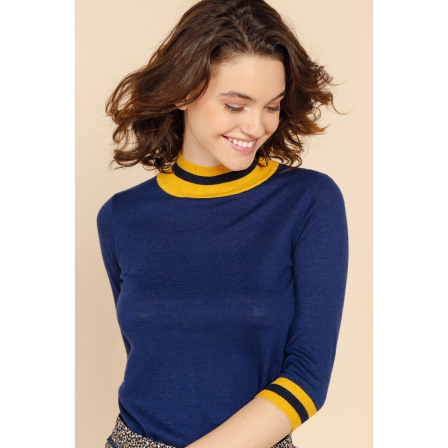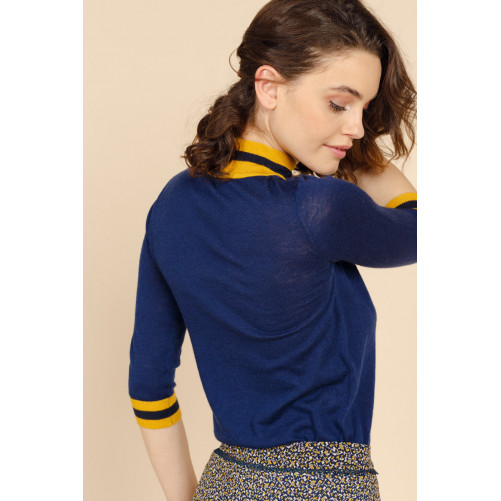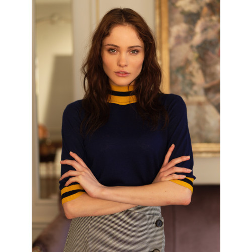 • Rayures couleur jaune moutarde sur le col et les manches.