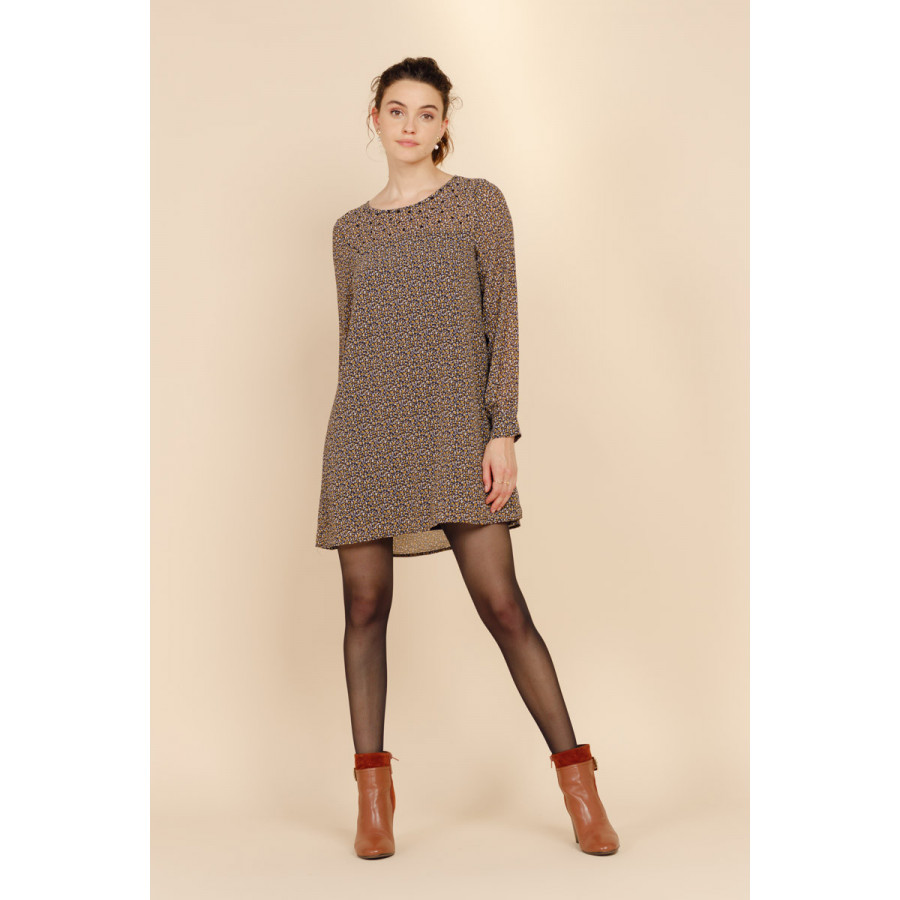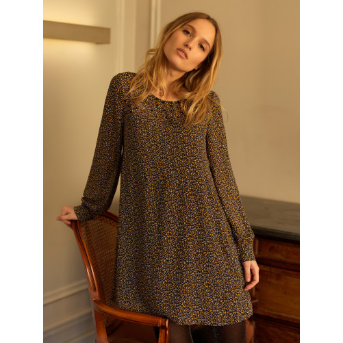 Cette robe courte et ample affiche un bel imprimé géométrique qui apporte une note joyeuse dans le vestiaire féminin.