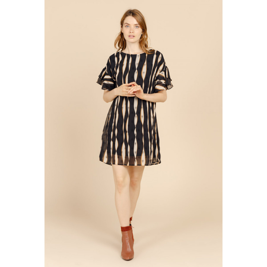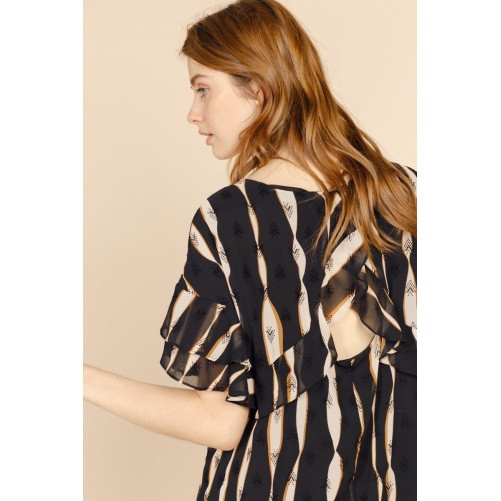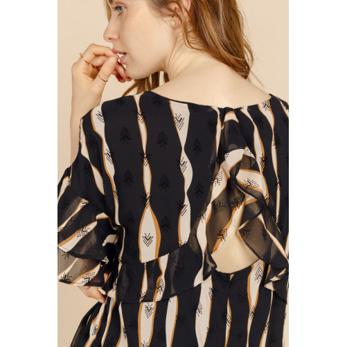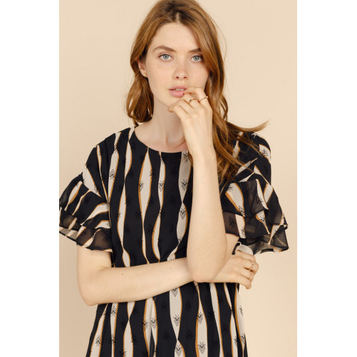Les manches courtes se parent de volants légers et transparents pour apporter du volume à cette tenue.